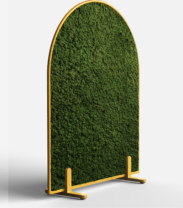 Das Modulor ist ein moosbedecktes Paneel, das an einem freistehenden Metallrahmen befestigt ist und als eleganter doppelseitiger akustischer Raumteiler eingesetzt werden kann.