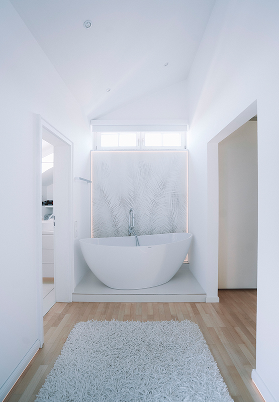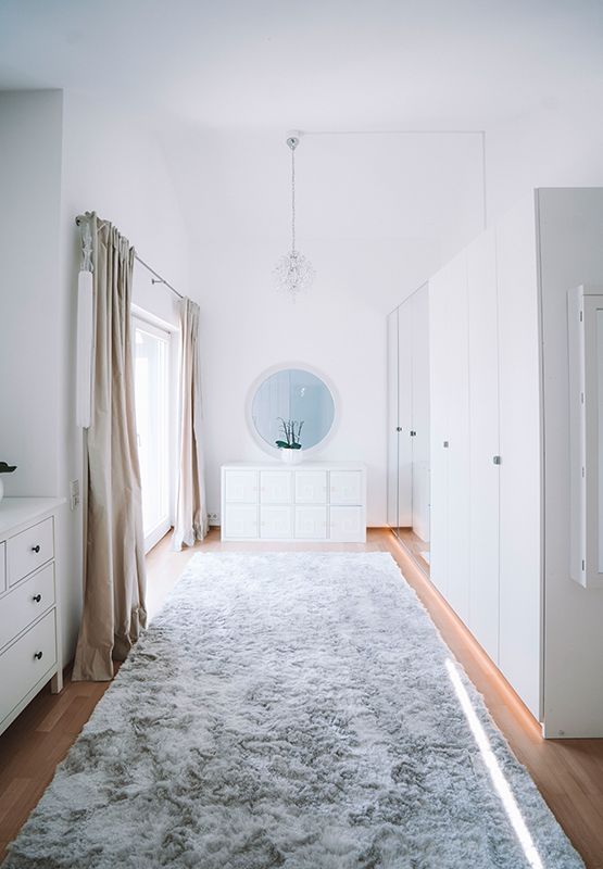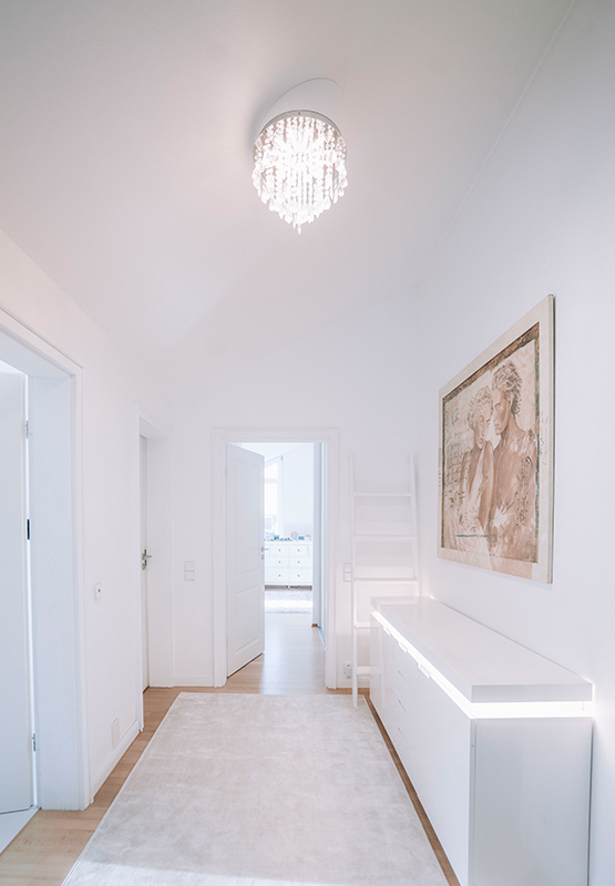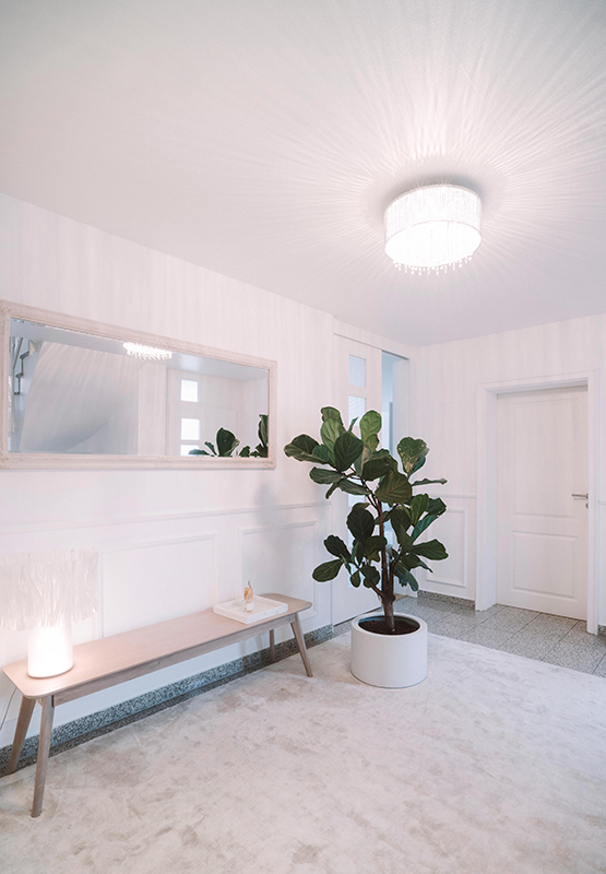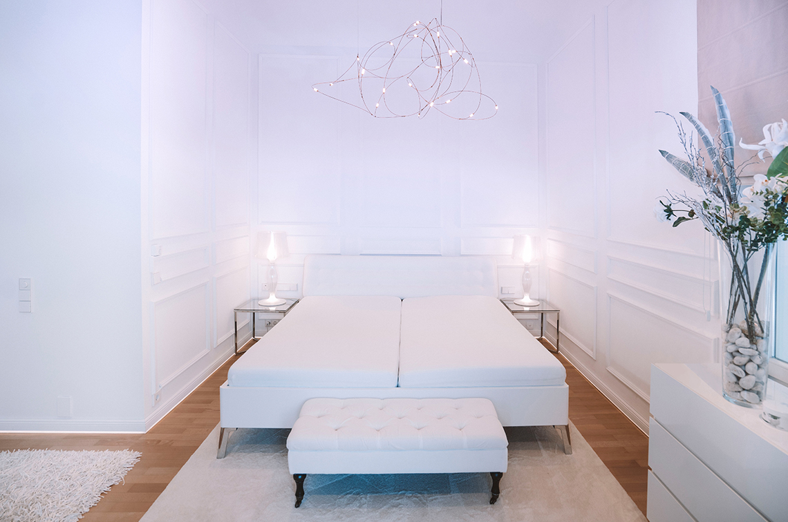 Am Bett aus dem Bestand der Kundin haben wir die integrierten Leuchten entfernt und diese durch Nachttischleuchten auf den neuen Glasnachttischchen ersetzt. Durch deren recht opulentes Design fiel die Deckenleuchte besonders filigran aus. Auch in diesem Raum haben wir mit Zierleisten an den Wänden gearbeitet. Dieses Details, der unter Bett und Bettbank platzierte Teppich und die indirekt beleuchteten Fußleisten haben das gesamte Flair im Raum verändert.