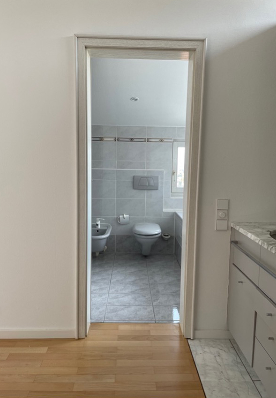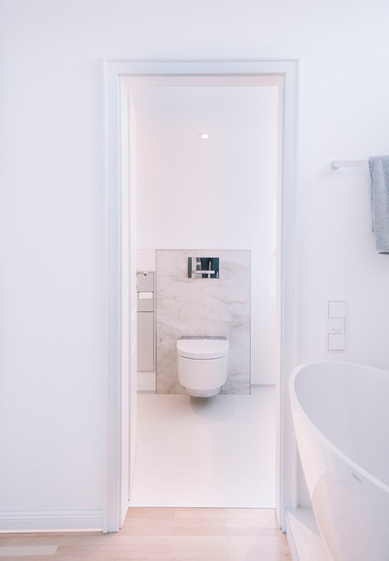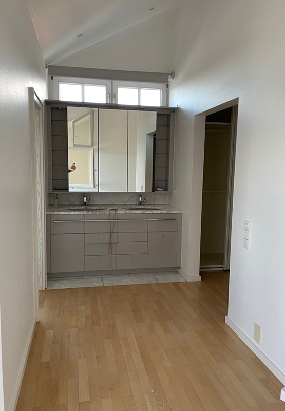Das Gästebad im Obergeschoss sollte den Look des Master Bads aufgreifen. Clean, hell, straight. Alles fast identisch. Allerdings wurde hier nicht entkernt, sondern ein Magnetbodenbelag verwendet, um die Optik des Bodens im Raum zu verändern.