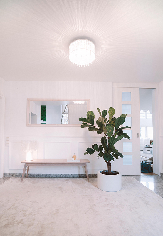 Der Spiegel verleiht dem Raum mehr Tiefe und die trendige Geigenfeige in ihrem cleanen weißen Gefäß rundet das Gesamtbild ab.