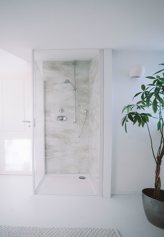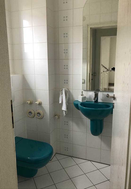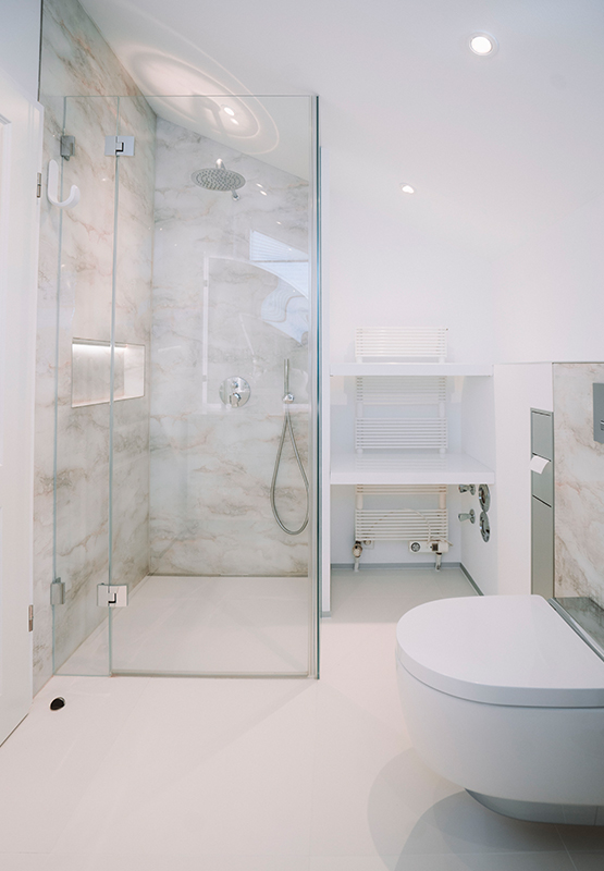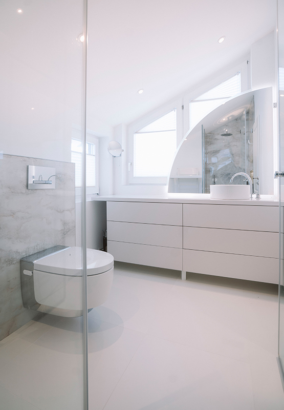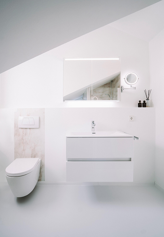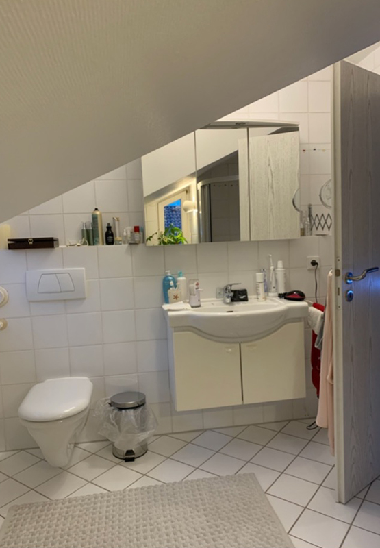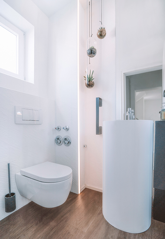 Im Gäste WC haben wir ebenfalls mit einem Magnetbodenbelag – hier in Holzoptik – gearbeitet. Die Wände wurden mit einer Tapete belegt die nicht nur nach weißem Schiefer aussieht – es ist auch weißer Schiefer drin. Neue Accessoires, raumhohe Spiegel und indirekte Beleuchtung, heben auch diesen Raum in das Jahr 2021.