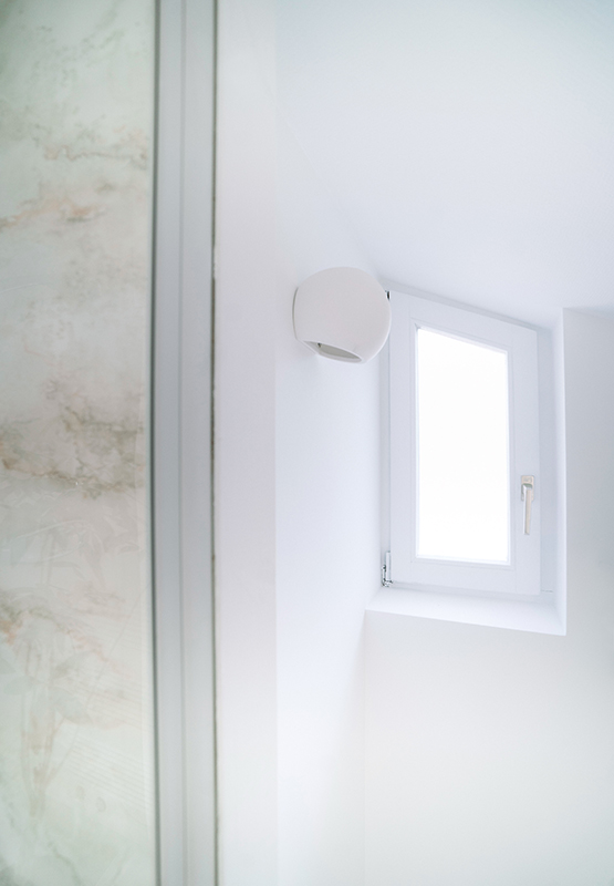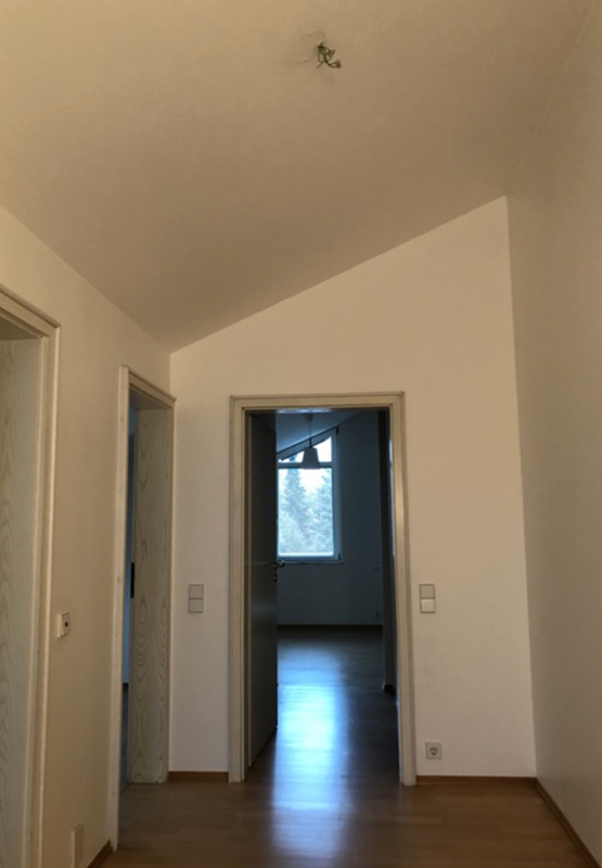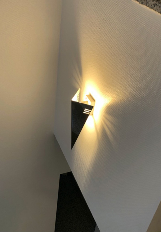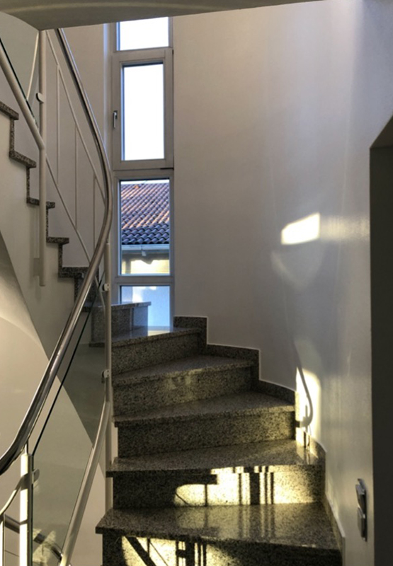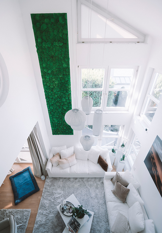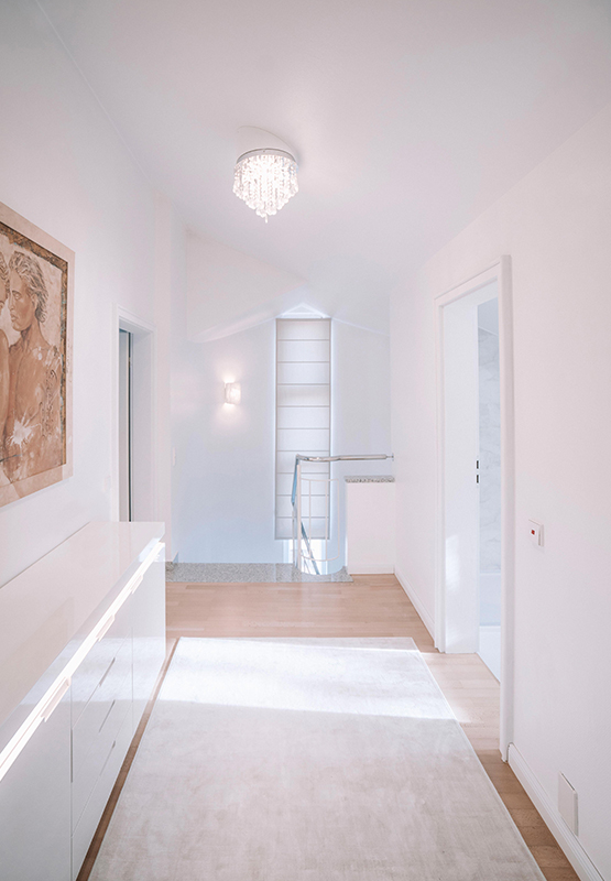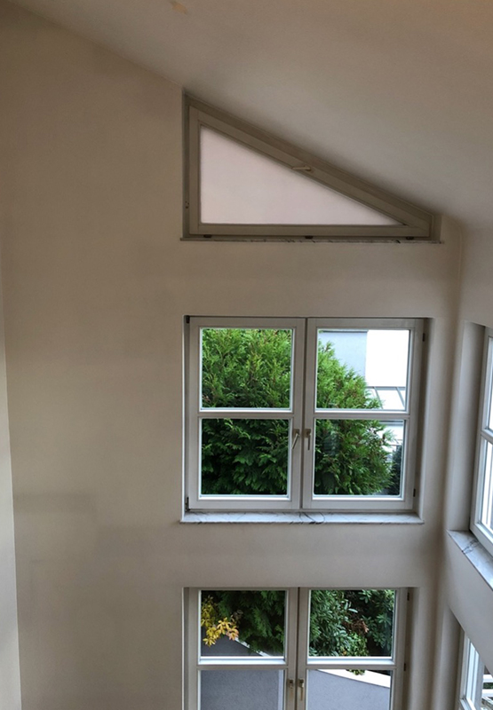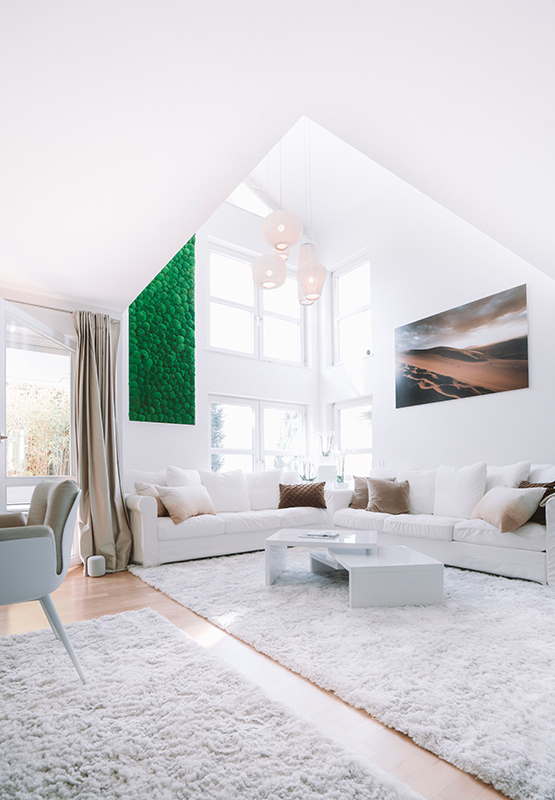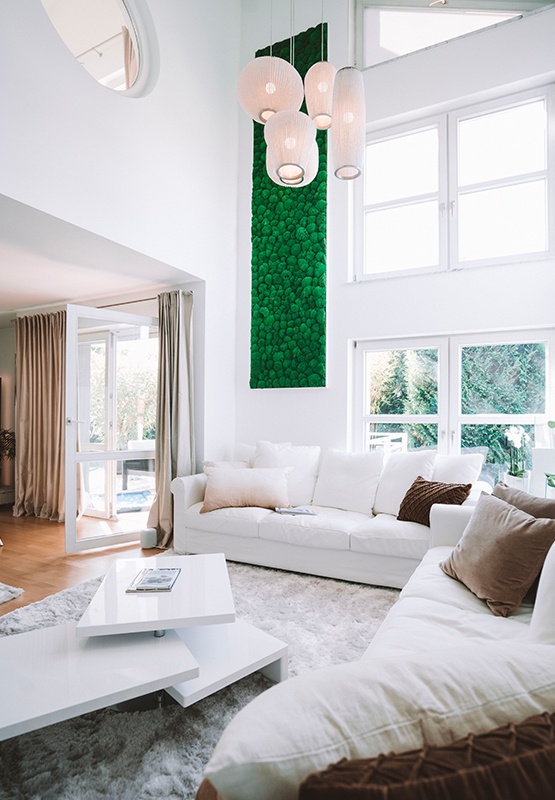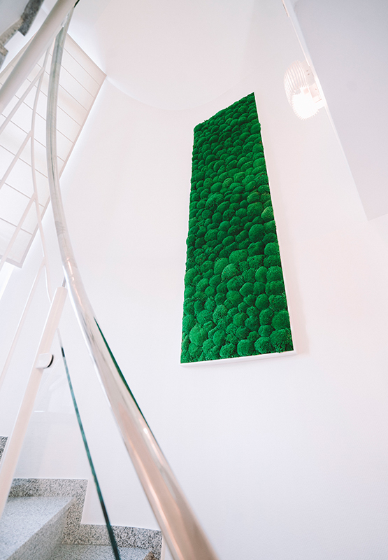 Die offene Geschossübergreifende Fensterreihe ließ der Nachbarin die Chance frei in das Treppenhaus und den Flur des Obergeschosses zu sehen. Diesen Zustand haben wir durch Raffrollos abgestellt und dem Raum damit auch einen hochwertigeren Look gegeben. Details wie der Tausch der Leuchten mit spitzer und metallischer Optik, hin zu einer Wandleuchte in einem hellen Korallenartigen Look und dem Grün des Moosbildes, das die Natur ins Haus holt, macht jeden Gang nach oben und unten zu einem angenehmen Erlebnis. Das Moosbild ist eingefasst in einen Rahmen und mit einer Unterkonstruktion in die Rundung des Treppenhauses gehängt.