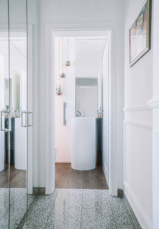 Aus dem grauen, kühlen Eingangsbereich wurde ein heller einladender Raum. Die Türrahmen wurden weiß gestrichen, die Türblätter getauscht. Die Glaseinsätze der Schiebetür zum Wohn-Essbereich wurden mit Milchglaseinsätzen beklebt. Besonders wohnlich machen den Bereich die angebrachten Zierleisten. Ein Tutorial hierzu findet ihr auf meiner Website in der Rubrik Blog & Projekte.