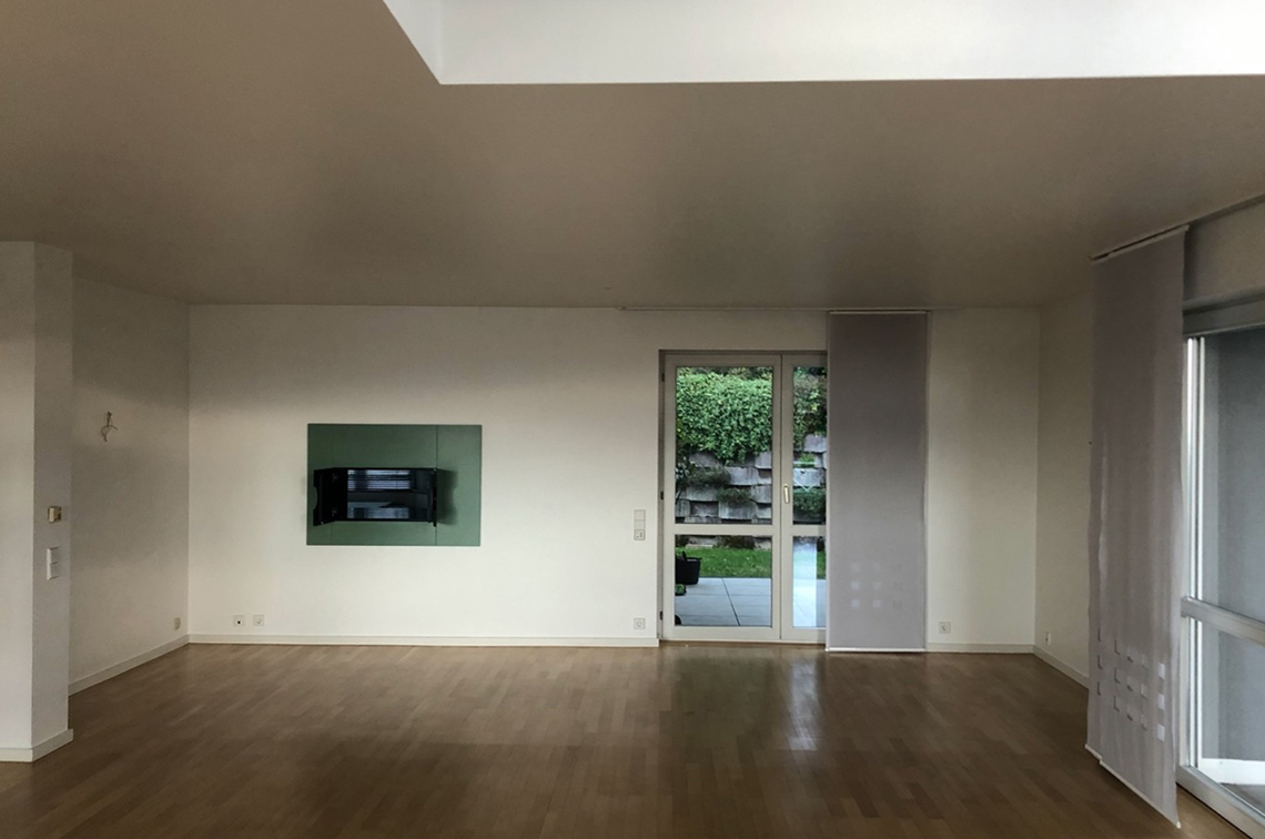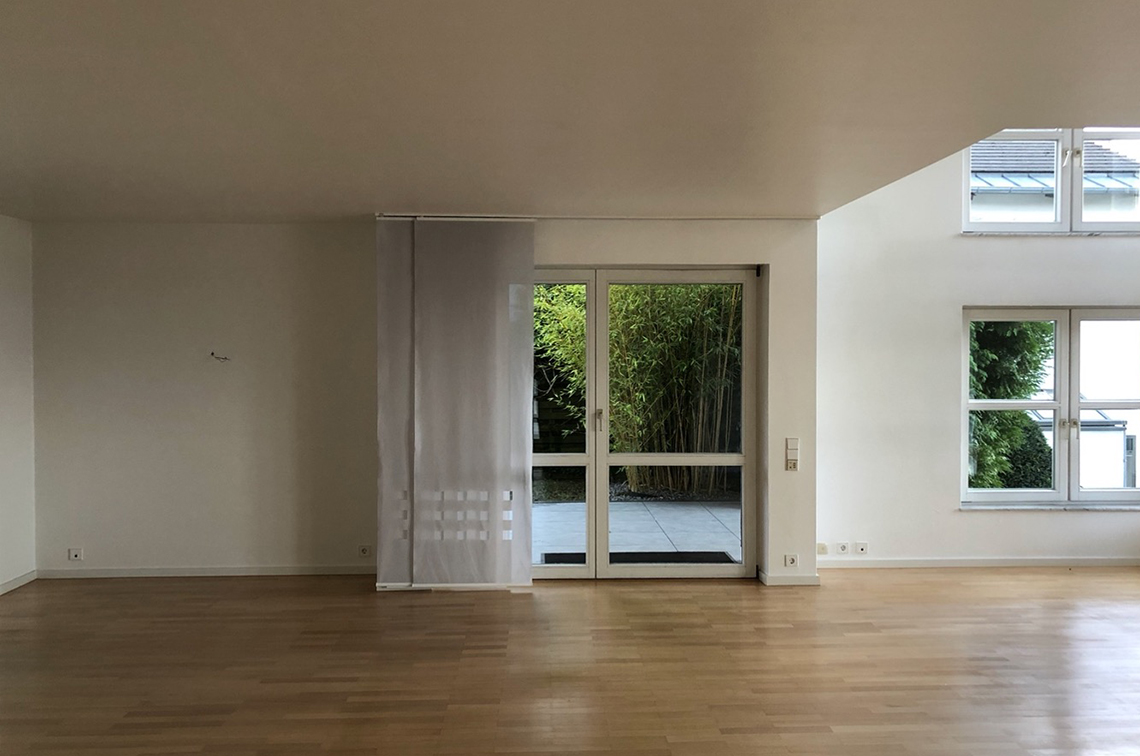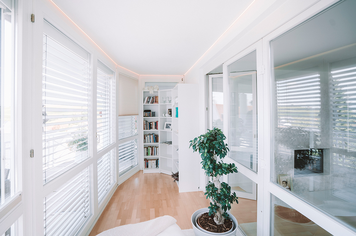 Zu guter Letzt bestand der Wunsch im nicht beheizten Wintergarten eine Bibliothek und Leseecke zu gestalten. Hierzu haben wir die Decke des Raumes mit einer Infrarotheizung und indirekter Beleuchtung ausgestattet. Gardinen, ein Teppich, Plisees ans den Fenster, Bücherregale, Leseleuchte, Recamiere und Pflanze – und fertig ist der Relaxbereich mit wunderschönem Ausblick.